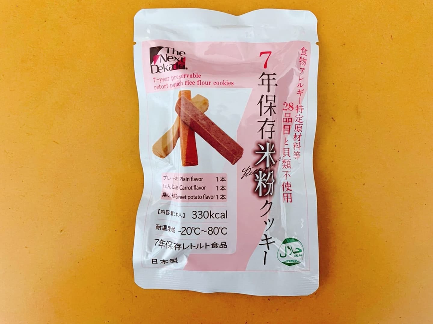 7年保存できるレトルト食品は、封をあけてすぐ食べられます。特定原材料等28品目と貝類不使用です。米粉クッキーもあります。一番驚いたのは、裏側の原材料は日本語だけでなく英語でも記載があること。ハラール対応です。お水がないとき等など、すぐに食べられるリゾット系も用意しておきたいですね。