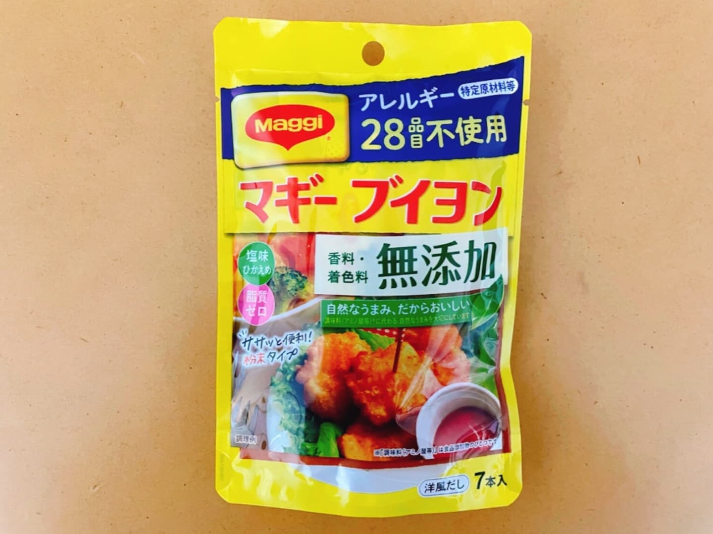 無添加のブイヨン。スーパーでも購入できる商品でもありますが、黄色の袋のシリーズが何種類もあるので、実は28品目不使用のブイヨンがあることを知らない方もいます。あるんです!28品目不使用が。目印は黄色の袋に青色のラインが目印です。お湯を注ぐだけでスープにもなるし、お野菜を煮込むだけで立派なポトフになります。たくさんの人に知ってもらえたら、子ども食堂や炊き出しなどで活用できるのではないかと思います。