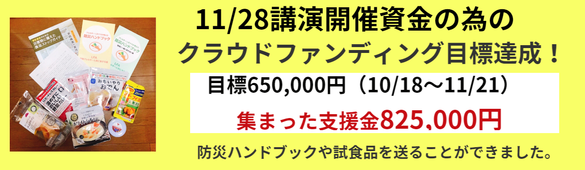 今回、クラウドファンディングにご支援いただいた方には、11月28日(日)LFAアレルギー防災講演オンラインの限定公開視聴リンクを送らせていただきます。(1カ月間視聴可能)どうぞ、ご支援宜しくお願い致します。