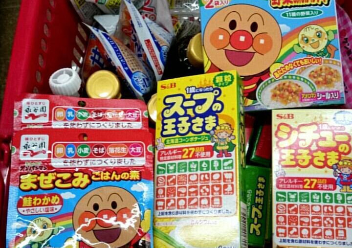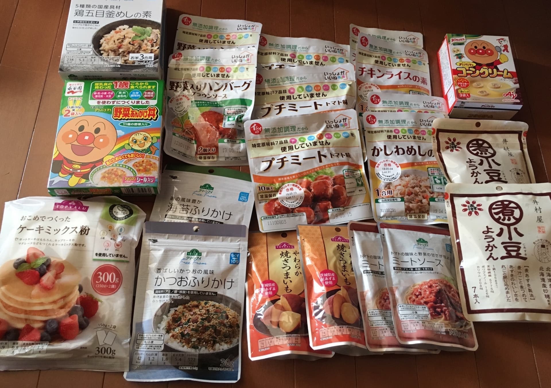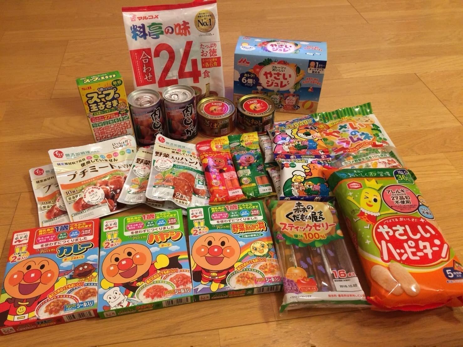 ・富士見にくじゃが×2・マルハサバみそ煮・マルハ月イワシ・マルコメ即席みそ汁・フルーツやさいジュレ・アンパンマンミニ野菜あんかけ丼・アンパンマンハヤシポーク・アンパンマンMカレーポーク・たべっ子ベイビー・やさいのラムネ・やさしいハッピーターン・森のくだもの屋スティックゼリー・アンパンマンソーセージ、×2・スープの王子様・いっしょがいいねプチミート×2・いっしょがいいね野菜入りハンバーグ×2