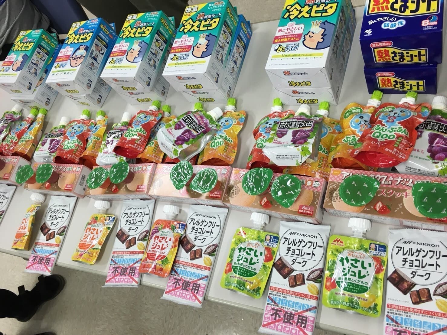 ・おいしい玄米丸パン×10・お米で作ったまあるいパン×3・お米で作ったしかくいパン×3・豆乳ブレッド×3・アレルゲンフリーチョコレート×8・クラッシュ蒟蒻畑ぶどう×6・ぷるぷるんQOOりんご×6・ぷるぷるんQOOみかん×6・フルーツやさいジュレ・いちごゼリー・ぶどうゼリー・ライスクッキーいちご味×6・冷えピタ大人用×6・冷えピタ子ども用×4・スマイル40EX・快適ガード・熱さまシート大人用・熱さまシート子ども用