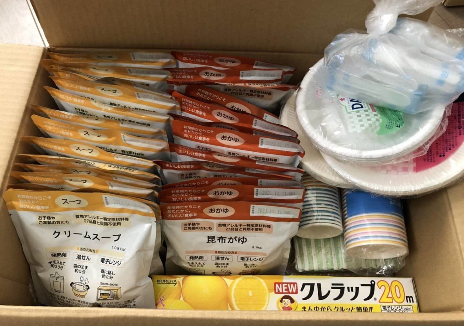 (以上、特定原材料7品目不使用製品)・熱中症対策ゼリーぶどう味 10個・フローズンゼリーソルトアンドライチ味 5個・フローズンゼリースポーツドリンク味 5個・ミックスビーンズ 3パック・ゆでとうもろこし 4本・干しいも 2袋・紙皿 30枚・スプーン 22本・ラップ 3本