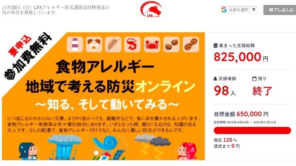 今回、クラウドファンディングにご支援いただいた方には、11月28日(日)LFAアレルギー防災講演オンラインの限定公開視聴リンクを送らせていただきます。(1カ月間視聴可能)どうぞ、ご支援宜しくお願い致します。