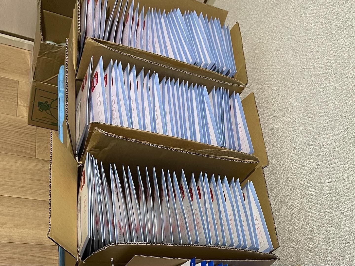 宛名を貼るステッカー貼り作業、今回もコロナの関係で少数精鋭でする予定です。